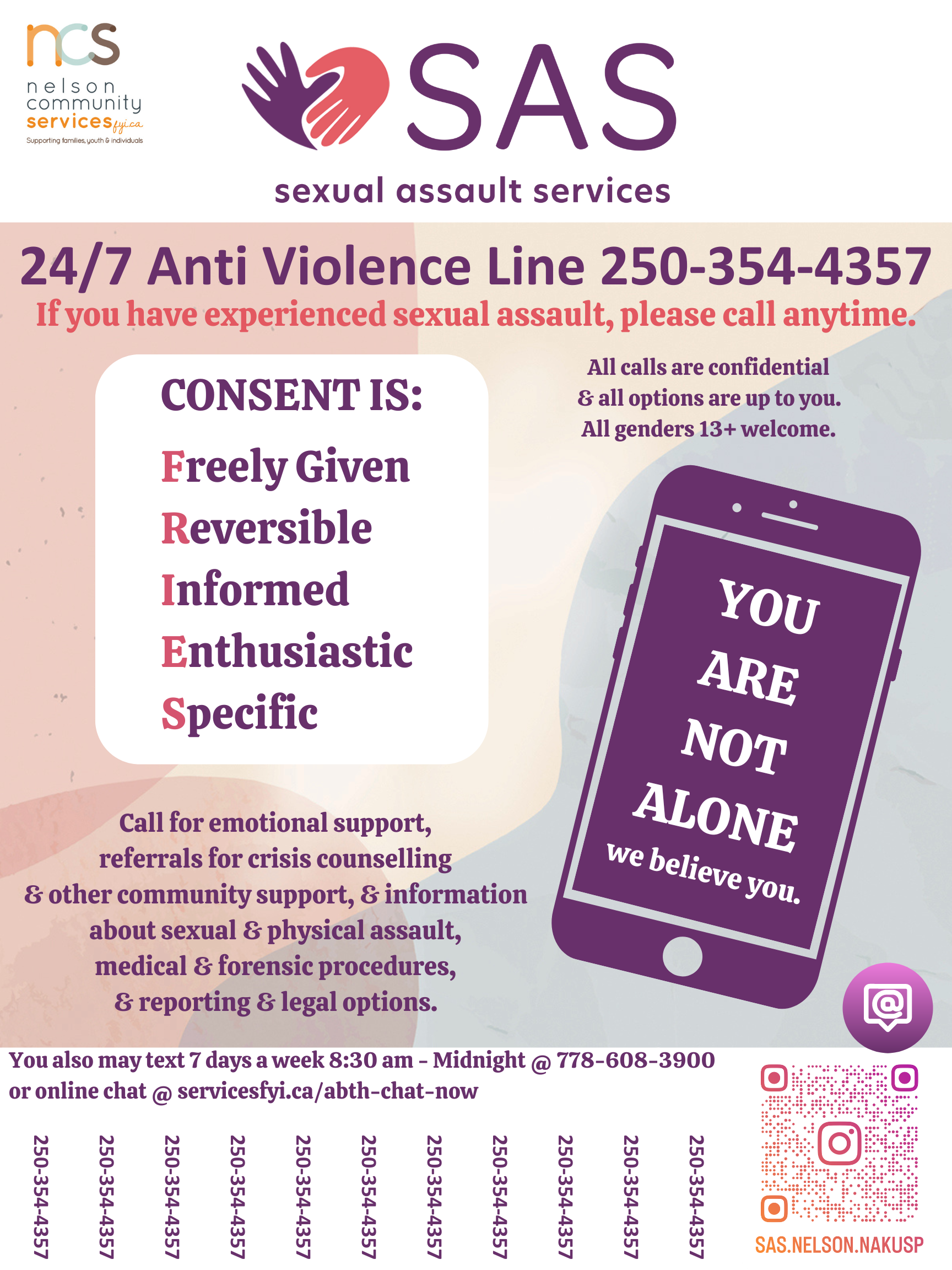 Sexual Assault Services is on Instagram + Facebook. Our intention is to use these spaces to educate community, validate survivors, share information about our services, & inspire action to address the root causes of violence. We invite you to give us a follow @sas.nelson.nakusp to stay connected.